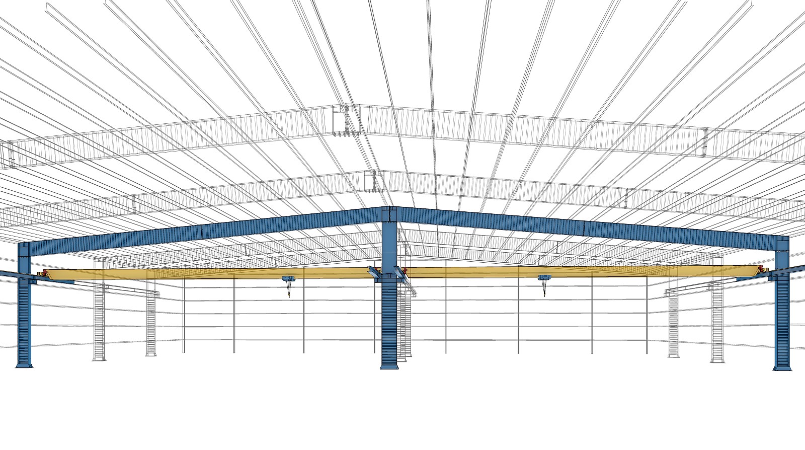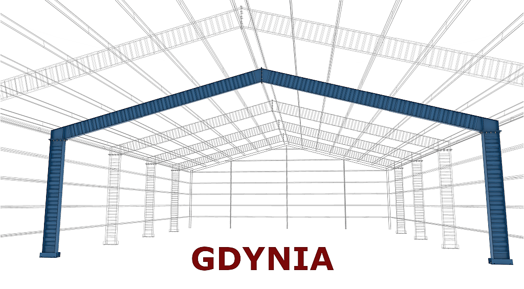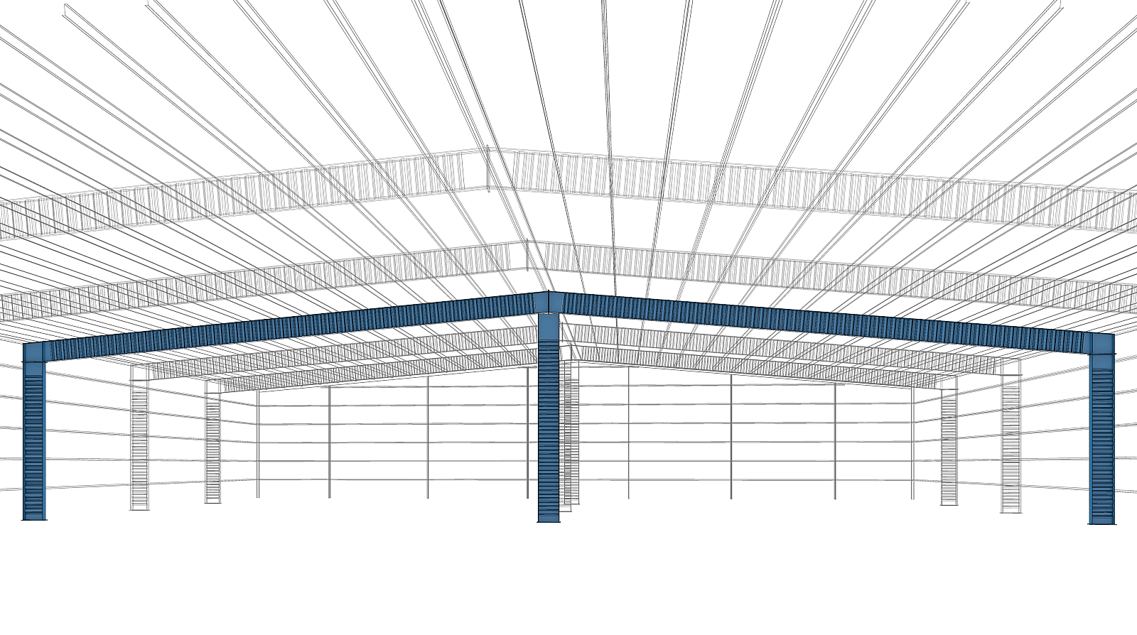 Rám, ktorý je široko používaný v priemyselných halách s nízkym sklonom strechy a väčším rozpätím. Možnosť prípravy pre žeriavovú dráhu.
