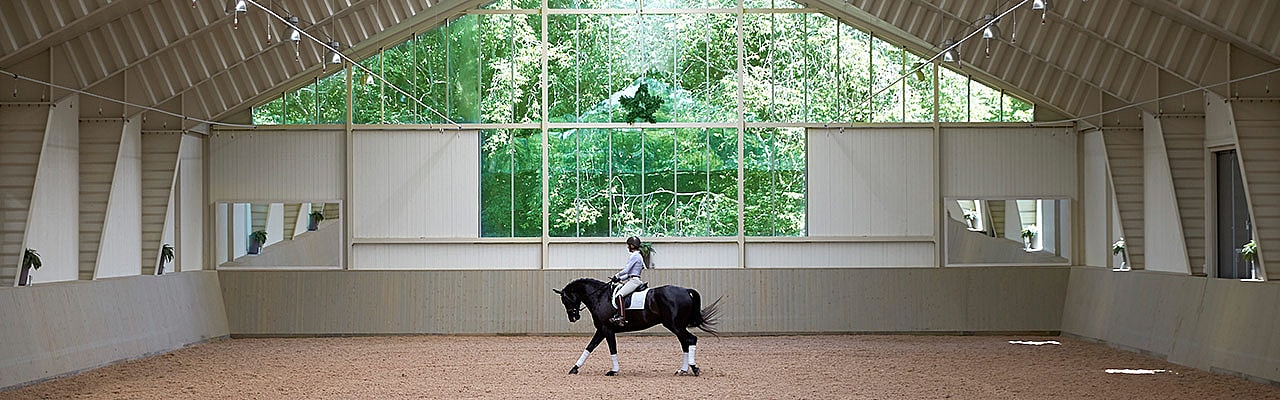 „Rozhodli jsme se najmout architekta, který nám pomohl vybrat umístění pro jezdeckou halu a navrhl povrchovou úpravu budovy. O barevném schématu jsme měli vlastní představu. Bylo pro nás důležité, aby měla budova vlastní charakter a zároveň přirozeně zapadala do prostředí,“ říká Annette.